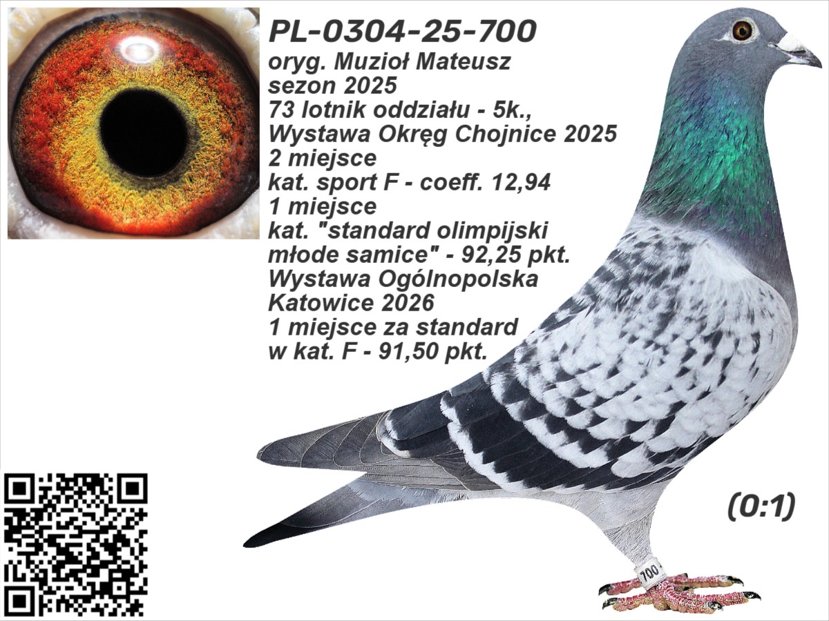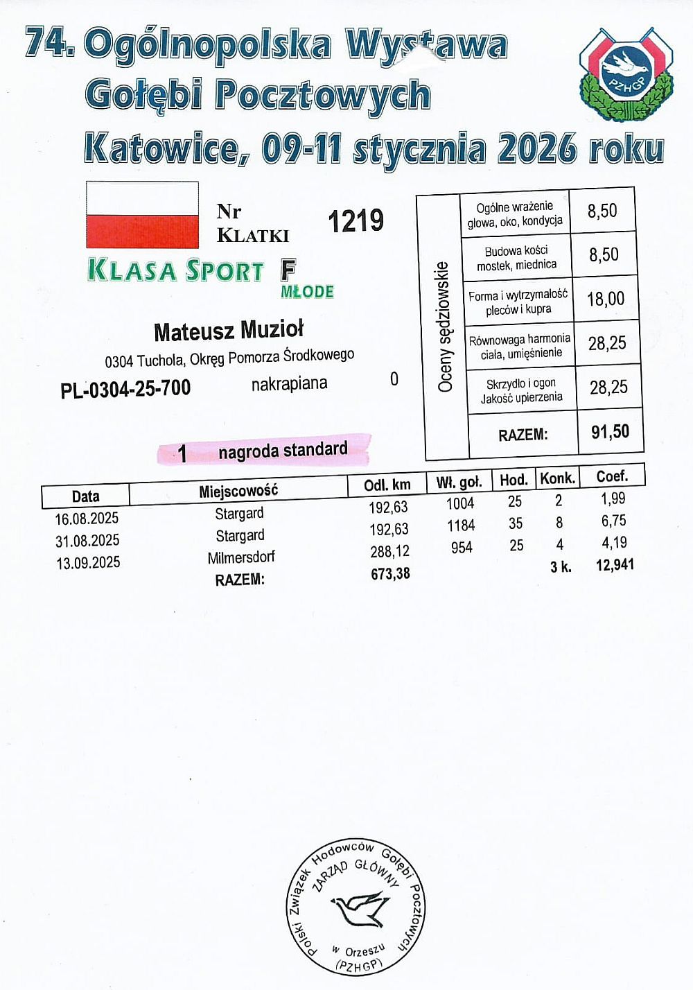 PL-0304-25-700oryg. Muzioł Mateusz - Oddział 0304 Tuchola, drużyna: Muzioł Mateusz, sezon 2025 - 73 lotnik oddziału - 5k., Wystawa Okręgu Pomorza Środkowego - Chojnice 2025 - 2 miejsce - kat. sport F - coeff. 12,94; 1 miejsce - 92,25 pkt. - kat. "standard olimpijski młode samice", Wystawa Ogólnopolska Katowice 2026 - 1 miejsce za standard w kat. F - 91,50 pkt.