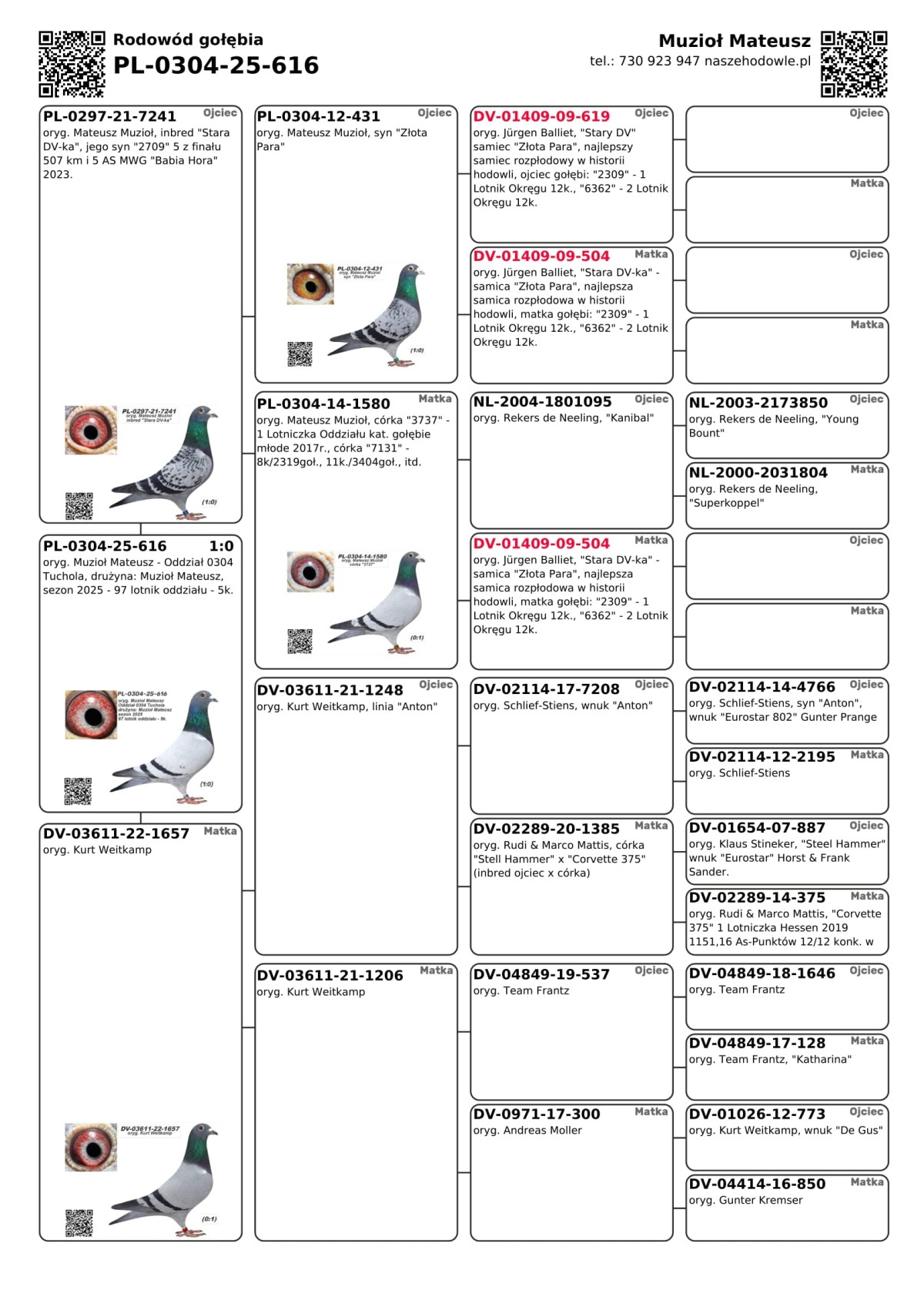 | Lp. | Lot | Data | Dystans [km] | Ilość gołębi | Pozycja gołębnik | Pozycja oddział (GL) | Prędkość [m/min] | Coeff. |