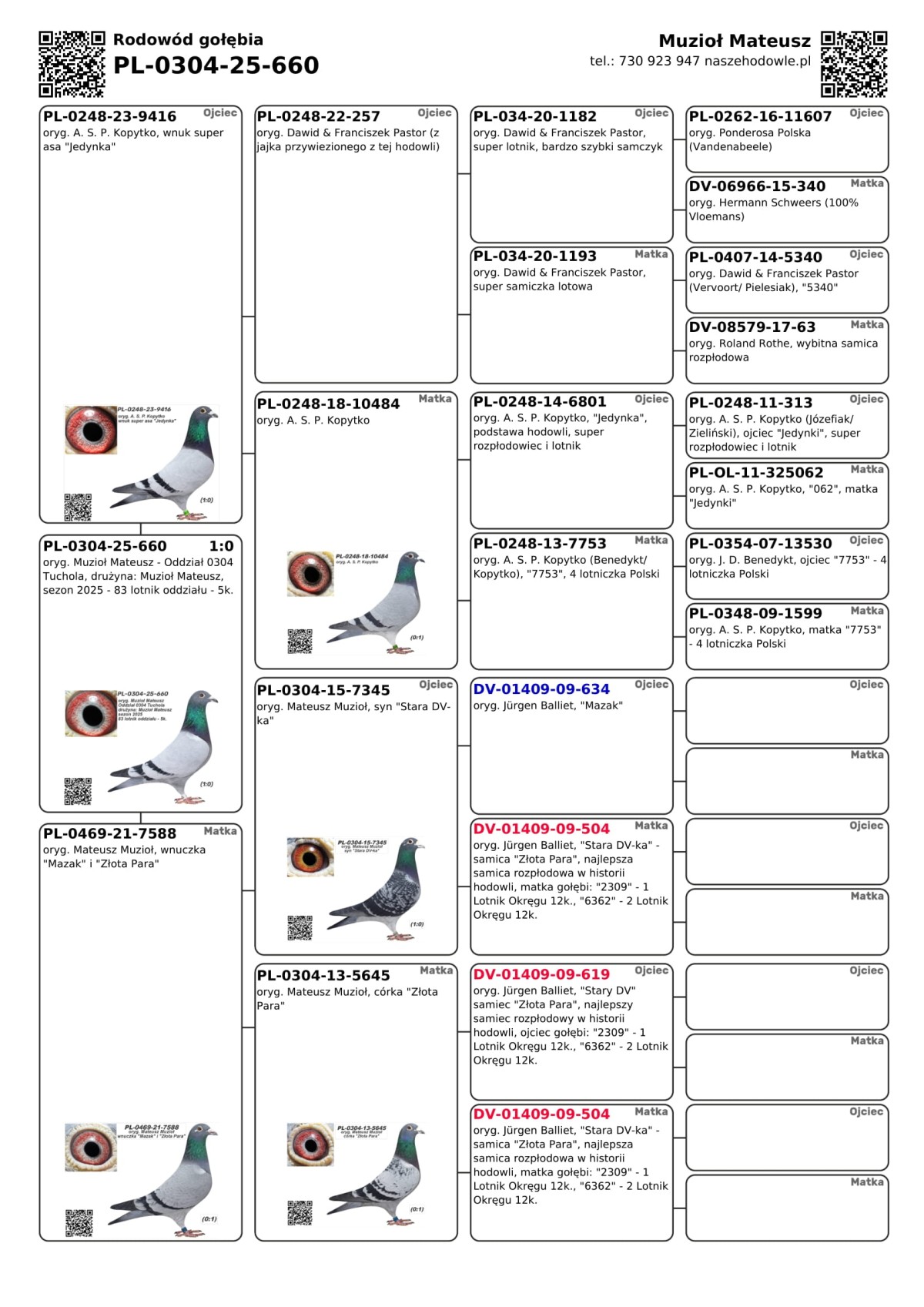 | Lp. | Lot | Data | Dystans [km] | Ilość gołębi | Pozycja gołębnik | Pozycja oddział (GL) | Prędkość [m/min] | Coeff. |
