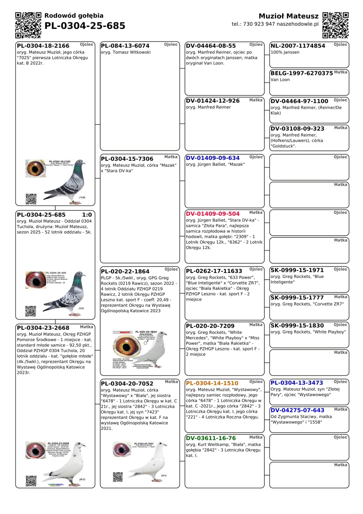 | Lp. | Lot | Data | Dystans [km] | Ilość gołębi | Pozycja gołębnik | Pozycja oddział (GL) | Prędkość [m/min] | Coeff. |