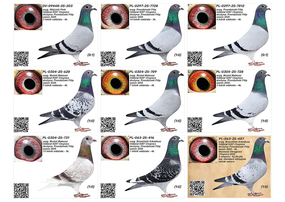 | Lp. | Lot | Data | Dystans [km] | Ilość gołębi | Pozycja gołębnik | Pozycja oddział (GL) | Prędkość [m/min] | Coeff. |